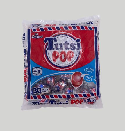paletas de caramelo macizo sabor cereza, rellenas de goma de mascar. Bolsa de 30 piezas. Peso del paquete 600 g (1.32 lb)